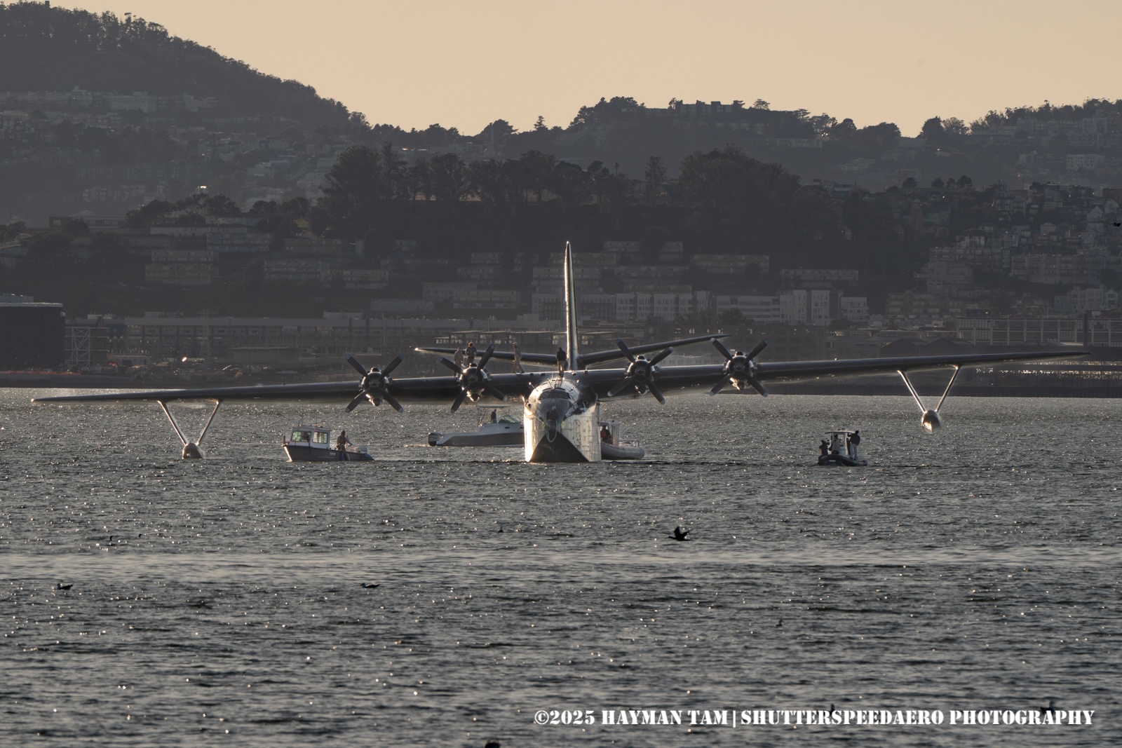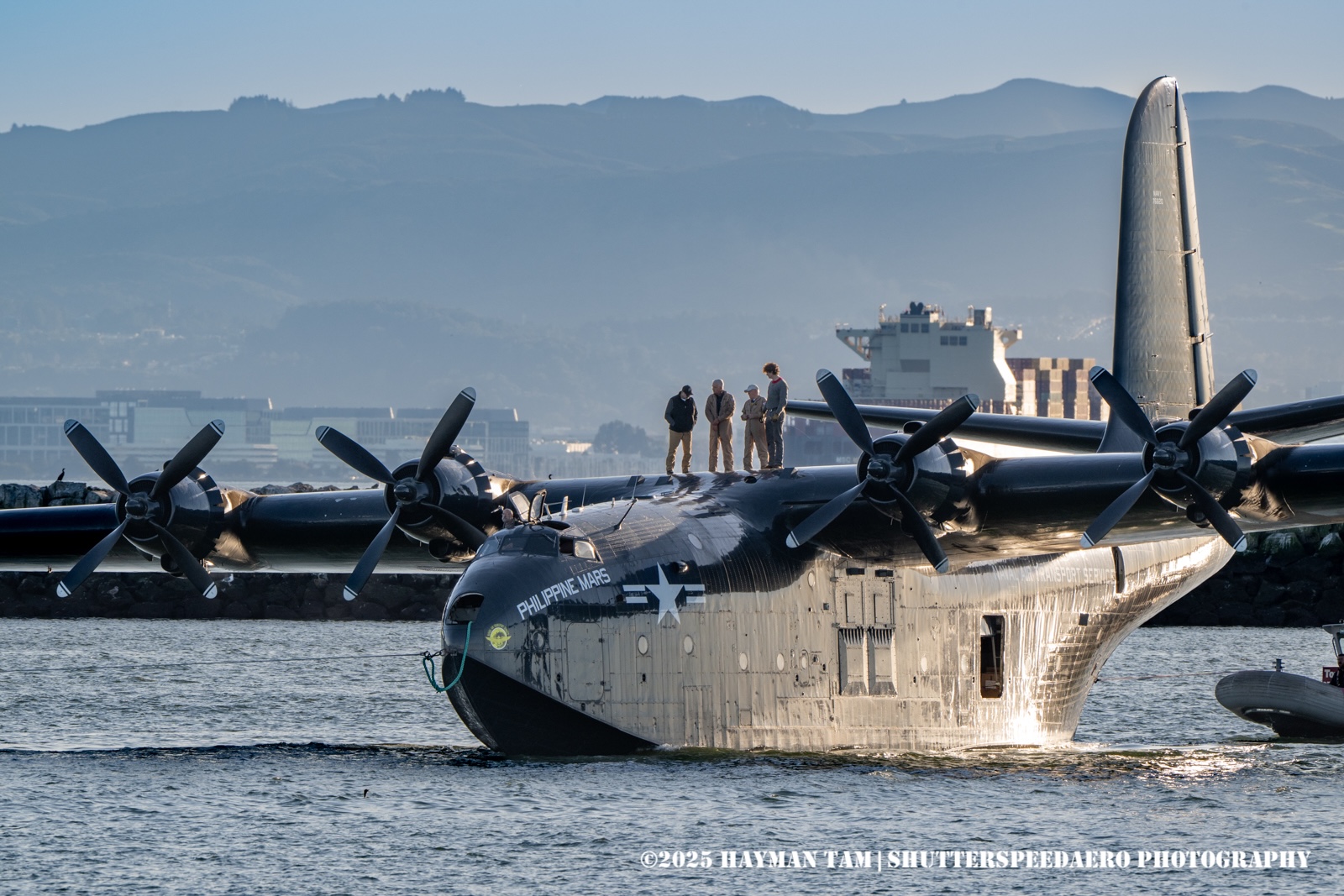 As a resident in the San Francisco region, I was excited that San Francisco and San Diego were announced as overnight stops for the big seaplane. Both areas have deep seaplane roots, with U.S. Navy seaplane squadrons operating the Mars at bases in both cities. I witnessed the arrival from the Seaplane Lagoon in Alameda, site of the former Naval Air Station. This location was a bit far from the landing and a breakwater intruded on the view. We had all hoped to see the Mars taxi by under power but had to settle for her being towed instead.
