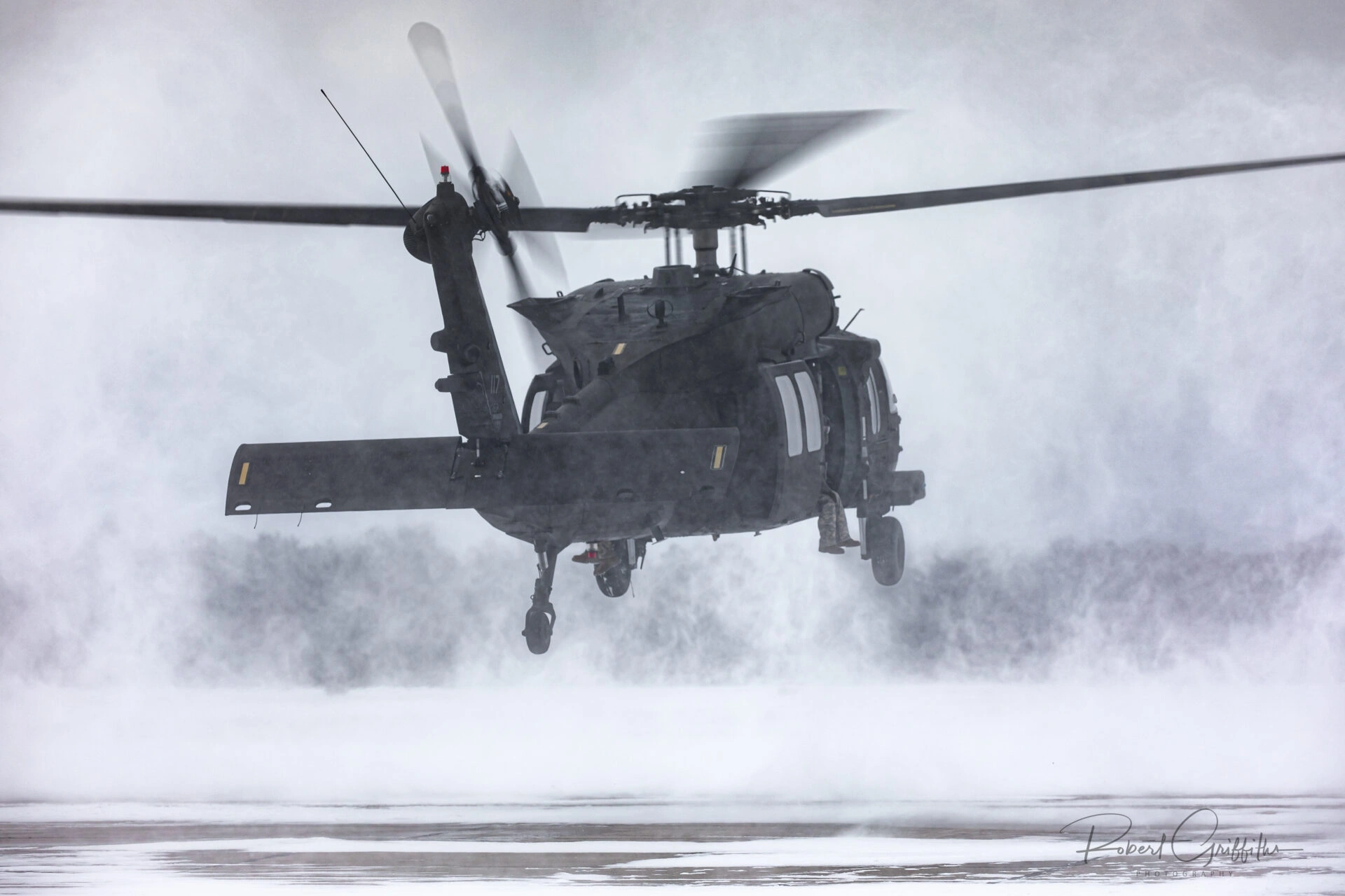 Several hours and messages later it still wasn’t looking great weather wise, and the snow falling incessantly only compounded the sinking feeling that this just wasn’t going to be our day. It definitely became a spotter moniker of ‘Hurry up and wait’. At last the snow stopped, but now the cloud ceiling was causing issues but was set to clear in the next couple of hours. More good news, a duo of Grand Ledge based Blackhawks was on its way north to also complete some training.