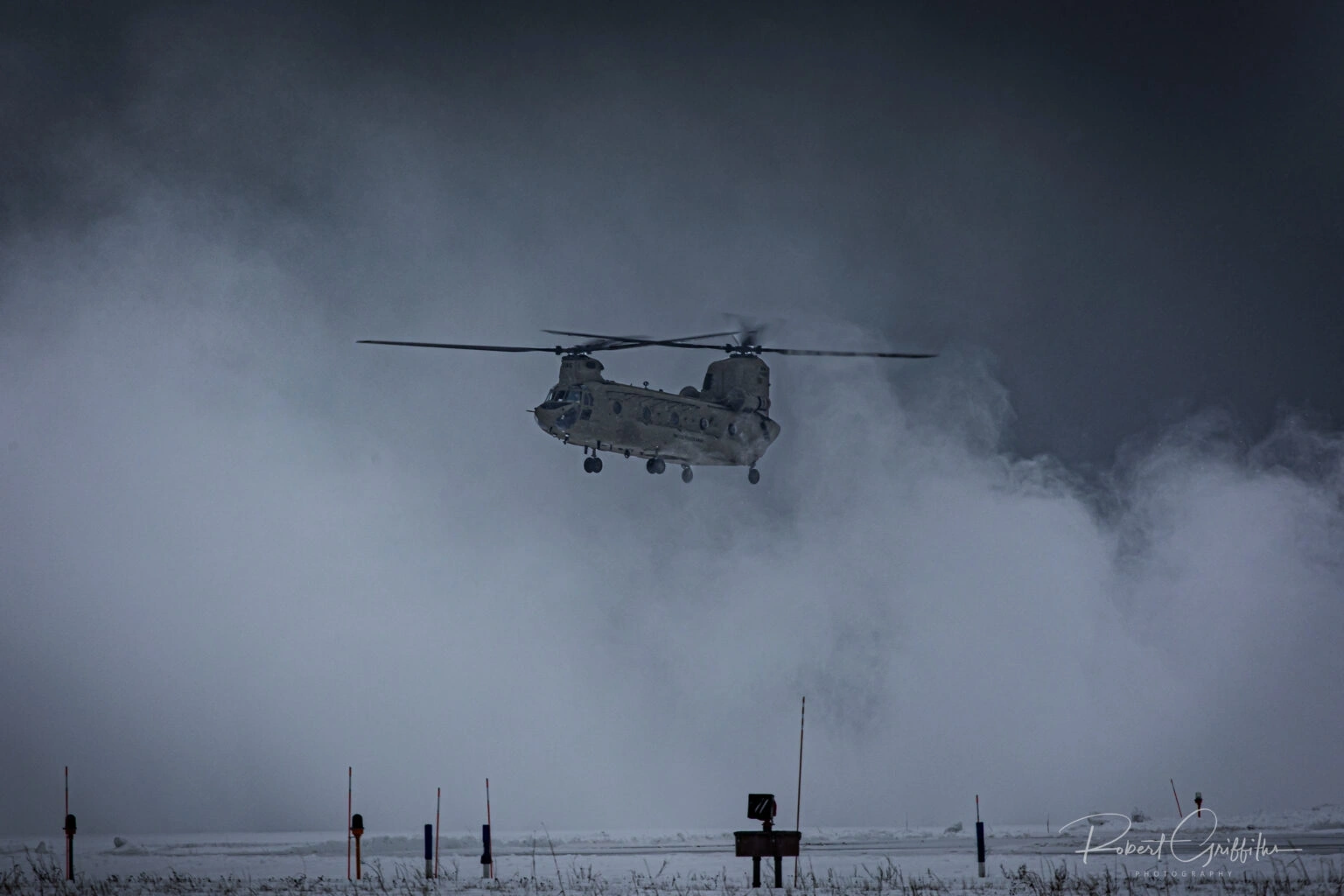 Back on the base, the Chinook was already running, waiting to start its work on getting a massive M777 Howitzer latched on for the Wisconsin NG training. We found our spot and watched as the Chinook lifted a few feet above the apron and held its position… which usually means, yup, there’s the two Blackhawks coming in from the South, now was the time to start snapping away in the frigid temperatures. Oddly enough, with my adrenaline spiked as it usually does with aviation the cold didn’t seem to bother me for some time, especially when I was witnessing something for the first time.