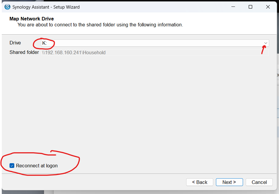 net use k: \\192.168.160.241\Kenward /PERSISTENT:YES / user:”MY NAS Name ort IP”\”my user name”