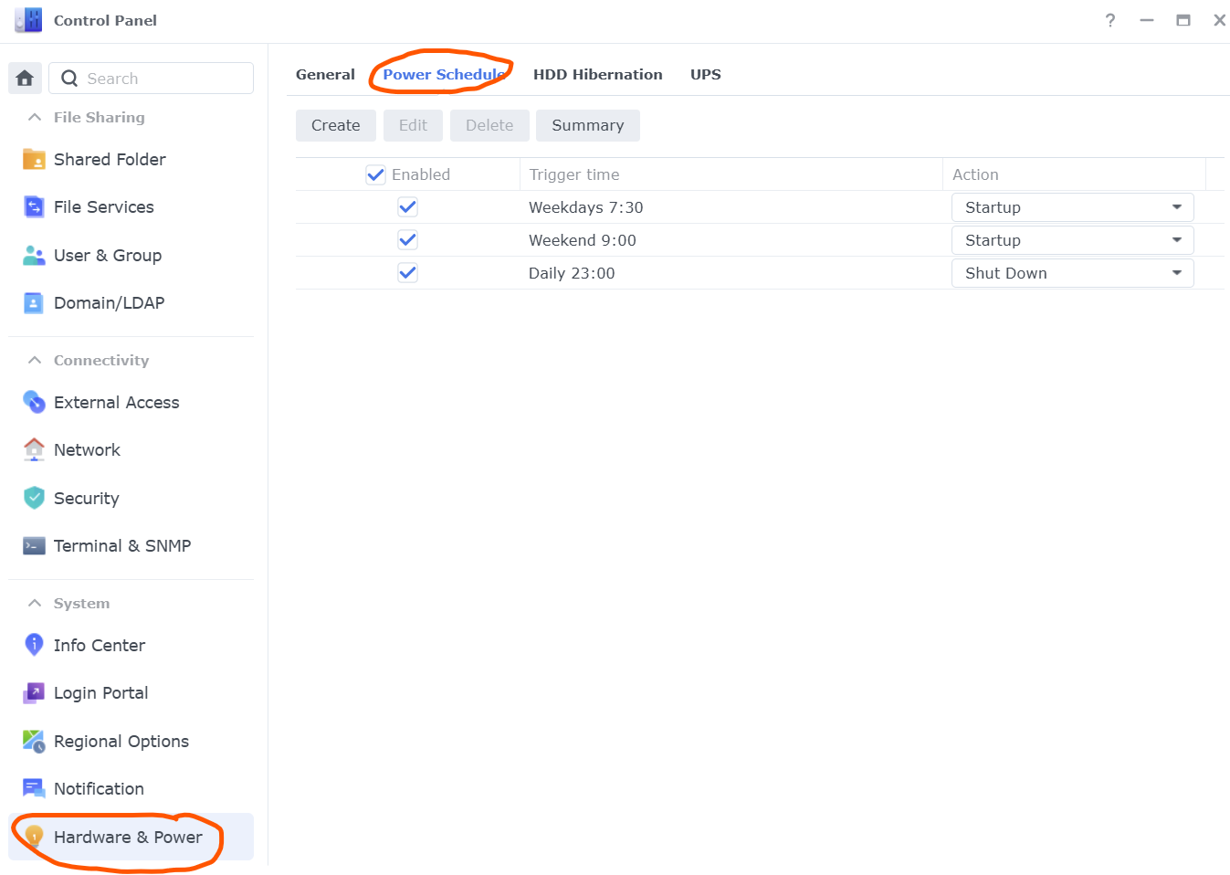 - Hardware and Power – a place to set a power schedule if you want to turn it on and off at set times